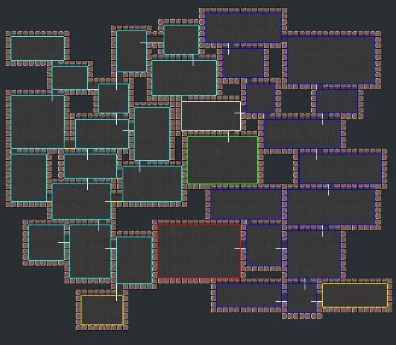 In this example, I’ve included the minimum spanning tree generated during the dungeon building process. If you note the yellow corridors between rooms, those are randomly added between rooms within the same subtree.
